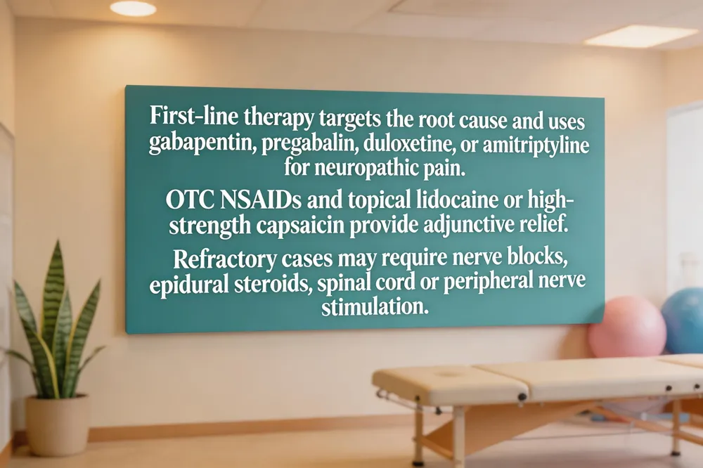 Peripheral neuropathy treatment begins with correcting the root cause—tight glycemic control for diabetes, vitamin B12 repletion, cessation of alcohol, or discontinuation of neurotoxic drugs. Once the underlying issue is addressed, pain relief is pursued with first‑line pharmacologic agents: anticonvulsants (gabapentin, pregabalin) and antidepressants (duloxetine, amitriptyline). These drugs target abnormal nerve signaling and are supported by extensive trial data. For mild or localized discomfort, over‑the‑counter NSAIDs and topical preparations such as lidocaine patches or high‑strength capsaicin creams provide symptom relief without systemic side effects. When pain persists despite medication, advanced interventional therapies are considered, including peripheral nerve blocks, epidural steroid injections, spinal cord stimulation, and peripheral nerve stimulation.