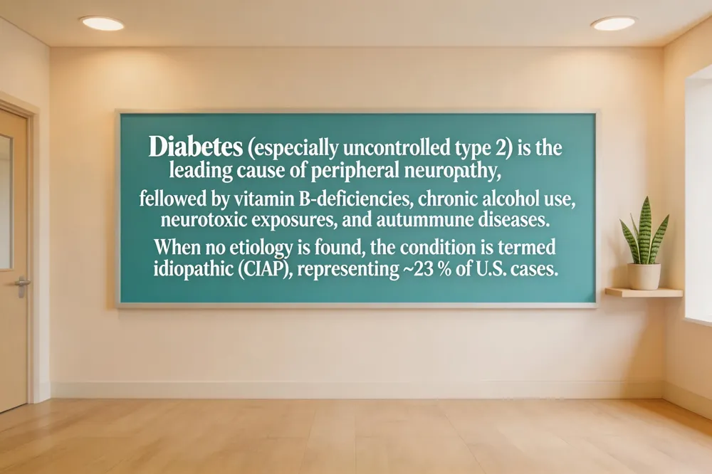 Diabetes mellitus is by clear single most common cause of peripheral neuropathy in the United States; more than half of people with uncontrolled type 2 diabetes develop nerve damage from chronic high blood‑sugar levels. Other major etiologies include vitamin deficiencies (especially B12, B1, B6, B9, and E), chronic alcohol misuse, exposure to neurotoxic chemicals or heavy metals, and autoimmune diseases such as lupus, rheumatoid arthritis, and Guillain‑Barré syndrome. When a comprehensive work‑up fails to identify any trigger, the condition is classified as idiopathic neuropathy—often termed chronic idiopathic axonal polyneuropathy (CIAP). CIAP accounts for roughly 23 % of peripheral neuropathy cases in the U.S., affecting an estimated 5–15 million adults, most of whom are over 60 years old. The worst aggravating factor for any neuropathy is uncontrolled hyperglycemia, which directly injures peripheral nerves and accelerates degeneration; smoking and excessive alcohol intake further compromise nerve blood flow. Importantly, neuropathy itself rarely shortens life expectancy—most patients enjoy a normal lifespan when the underlying disease is tightly managed, early diagnosis is made, and appropriate therapy is instituted.