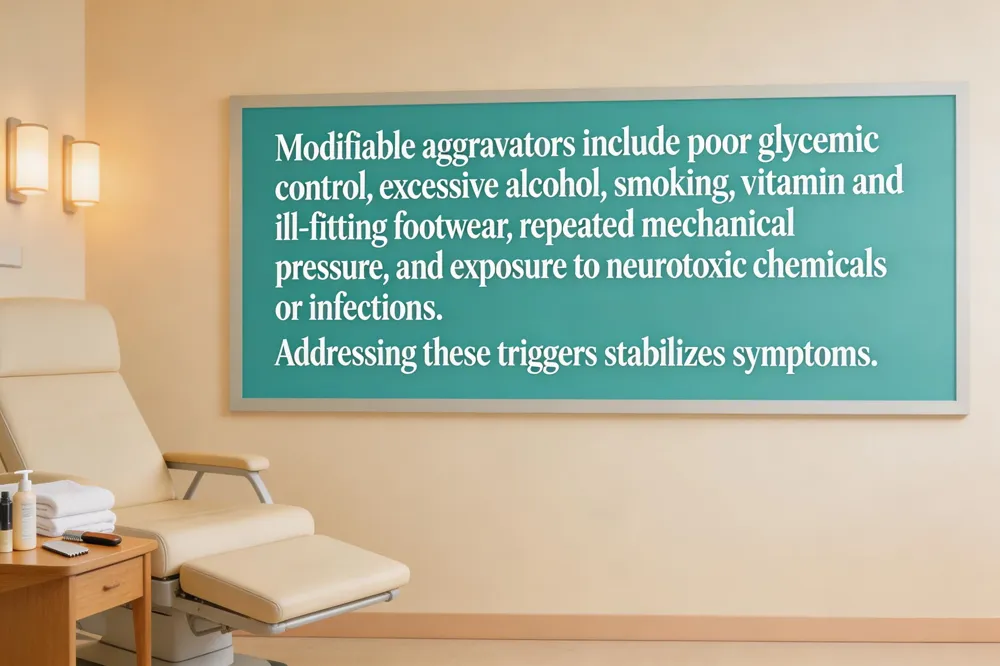 Neuropathy symptoms often flare when certain modifiable factors are not kept in check. Poor blood‑sugar control—especially in people with diabetes or pre‑diabetes—allows high glucose to damage the tiny blood vessels that nourish nerves, leading to increased numbness, tingling, and burning pain. Excessive alcohol use and smoking further compromise circulation and impair the nerves’ ability to repair themselves, accelerating symptom progression. Deficiencies of essential nutrients, notably vitamin B12, B1, B6, folate, copper and vitamin E, deprive nerves of the cofactors required for myelin production and metabolic health, making pain and sensory disturbances more pronounced. Mechanical pressure from ill‑fitting footwear, prolonged standing, or repetitive high‑impact activities can compress vulnerable peripheral nerves, especially in the feet and hands, while exposure to neurotoxic chemicals, heavy metals, certain chemotherapy agents, and infections such as HIV or Lyme disease can trigger acute worsening. Addressing these triggers through tight glycemic management, alcohol and tobacco cessation, adequate vitamin supplementation, proper footwear, and avoidance of known toxins is essential for stabilizing neuropathic symptoms and improving quality of life.