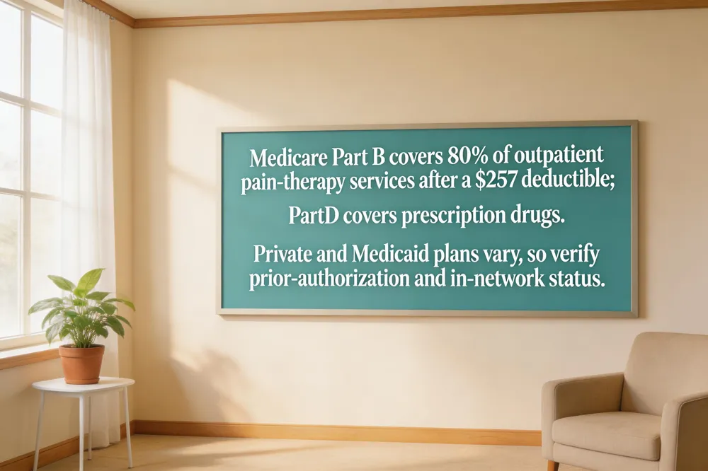 When Medicare pain‑management services are deemed medically necessary, most U.S. health‑insurance plans cover them. Under the Affordable Care Act, essential health benefits include prescription drugs, chronic disease management, outpatient care and mental‑health services, which together fund many pain‑therapy options. Medicare Part B pays 80 % of the approved amount for outpatient services such as injections, physical therapy, acupuncture (up to 12 visits for low‑back pain) and chiropractic care after the $257 deductible, leaving a 20 % coinsurance. Medicare Part D covers prescription pain medications, though copays vary by tier. Medicaid coverage varies by state; core medications and interventional injections are universal, while therapies like acupuncture or CBT may be limited to certain states. Private plans must offer essential benefits, but cost‑sharing—deductibles, copays, coinsurance, and annual out‑of‑pocket maximums—differs widely. Patients should verify prior‑authorization requirements and in‑network status to reduce unexpected expenses.
